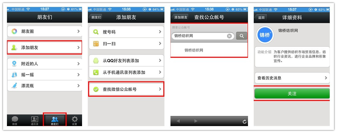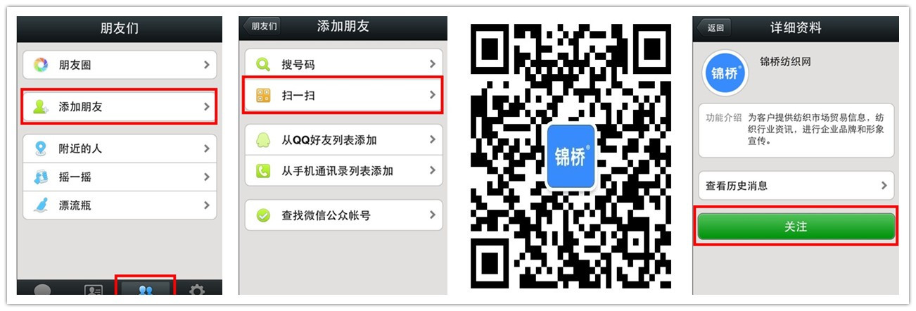 錦橋紡織網(wǎng)微信公眾號于2013年6月14日開通。我們將通過微信為紡織企業(yè)提供信息服務(wù),更快地將行業(yè)信息傳遞到您的手機(jī)上。 加入方法如下: 一、1.登陸您的微信;2.點(diǎn)擊朋友們——添加朋友;3.查找微信公眾帳號;4.輸入:錦橋紡織網(wǎng);5.點(diǎn)擊關(guān)注