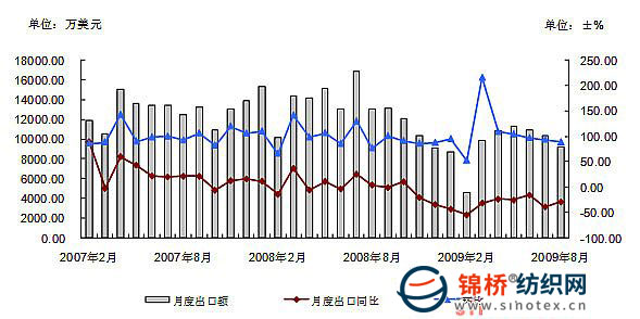 二、 紡織機(jī)械產(chǎn)品進(jìn)出口情況 據(jù)海關(guān)統(tǒng)計(jì),2009年1~8月我國(guó)紡織機(jī)械進(jìn)出口累計(jì)總額為23.75億美元,同比下降41.48%。其中:紡織機(jī)械出口7.57億美元,同比下降32.38%,最深降幅是1月(-47.78%)。紡織機(jī)械進(jìn)口16.19億美元,同比下降44.95%,最深降幅是1月(-64.37%)。紡織機(jī)械大幅持續(xù)雙降,但逆差正在逐步縮小,下圖反映了我國(guó)紡織機(jī)械進(jìn)出口月度及環(huán)比和貿(mào)易逆差的變化情況。