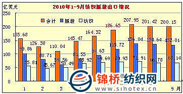 據(jù)海關(guān)總署最新發(fā)布進(jìn)出口數(shù)據(jù)顯示,2010年9月,我國(guó)紡織服裝出口200.15億美元,環(huán)比微降0.6%,同比增長(zhǎng)19.5%,其中服裝出口132.01億美元,環(huán)比下降1.95%,同比增長(zhǎng)19.1%;紡織品出口68.14億美元,環(huán)比增長(zhǎng)2%,同比增長(zhǎng)20.1%。 2010年1-9月,我國(guó)紡織服裝出口1498.15億美元,同比增長(zhǎng)23.1%,增速較1-8月回落0.6個(gè)百分點(diǎn)。其中服裝出口934.88億美元,同比增長(zhǎng)19%;紡織品出口563.27億美元,同比增長(zhǎng)30.7%。