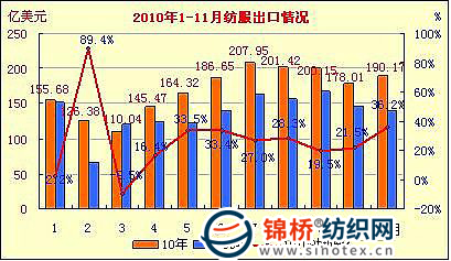 海關統(tǒng)計顯示,11月份,我國紡織服裝出口190.17億美元,環(huán)比、同比(下同)分別增6.8%和36.2%。其中紡織出口70.73億美元,分別增長12.4%和31.8%;服裝出口119.44億美元,分別增長3.8%和39%。1-11月,紡織服裝出口1866.2億美元,同比增長24.2%,增速較1-10個月提高1.2個百分點。其中紡織出口696.84億美元,同比增長29.6%;服裝出口1169.36億美元,增長21.2%。 今年來,我國紡織服裝出口保持了穩(wěn)定增長,但隨著持續(xù)爆漲棉價的傳導,出口數量逐漸萎縮,推動出口增長的動能逐步轉向出口價格上漲因素,9月份后這一現象表現尤為明顯。