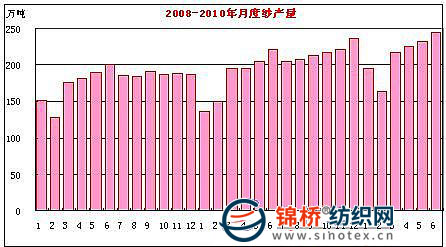 自2009年5月紗產(chǎn)量突破200萬(wàn)噸水平以來(lái),除今年1、2月份外,產(chǎn)量均保持在200萬(wàn)噸以上水平。據(jù)國(guó)家統(tǒng)計(jì)局統(tǒng)計(jì),2010年6月份,全國(guó)規(guī)模以上紡織企業(yè)產(chǎn)紗243.98萬(wàn)噸,創(chuàng)單月新高,同比增長(zhǎng)10.2%,環(huán)比5月增長(zhǎng)4.6%。2010年上半年累計(jì)產(chǎn)紗1269.69萬(wàn)噸,同比增長(zhǎng)17%,比2008年同期增長(zhǎng)22.7%。2009/10年度(2009年9月-2010年6月),10個(gè)月累計(jì)產(chǎn)紗2156.74萬(wàn)噸,折紡棉消費(fèi)約1030萬(wàn)噸,同比增長(zhǎng)16.7%。 另?yè)?jù)統(tǒng)計(jì),6月份生產(chǎn)布58.18億米,同比增長(zhǎng)12.9%。1-6月297.64億米,同比增長(zhǎng)16.4%。紗線、布產(chǎn)量統(tǒng)計(jì)數(shù)據(jù)如下表: