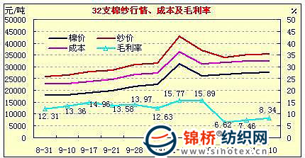 二是提高產(chǎn)品銷售價格,擴大產(chǎn)品利潤空間。由于游資在炒作棉花的同時,也加強紗的囤積,紗價漲幅快于棉價,擴大了紗線利潤空間。當棉價由9月中旬的18230元/噸猛漲13070元至11月中旬最高時的31300元/噸時,32支棉紗也由每噸26500元迅速升至43000元,漲幅16500元,漲幅高于棉價。按同步棉價計算,當時32支棉紗毛利率接近接近16%。而對部分使用前期低價棉的企業(yè),紗線提價后,毛利水平達到20%以上,大幅提高了紡織企業(yè)的利潤空間。走勢如下圖: