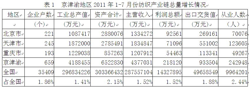 據(jù)國家統(tǒng)計局公布的數(shù)據(jù),2011年1-7月份我國京津渝三大城市(北京市、天津市、重慶市)紡織產(chǎn)業(yè)鏈(從紡織上游原料到下游服裝)規(guī)模以上企業(yè)數(shù)量為659家,占全國總數(shù)的1.86%;工業(yè)總產(chǎn)值為418.85億元,占1.41%;資產(chǎn)合計為652.28億元,占2.15%;主營收入為437.70億元,占1.52%;利潤總額為21.81億元,占1.52%;出口交貨值為93.35億元,占1.88%;從業(yè)人數(shù)為24.29萬人,占2.44%。由此可見,京津渝地區(qū)紡織產(chǎn)業(yè)鏈總產(chǎn)值、總資產(chǎn)、主營收入、利潤總額、出口和就業(yè)均給全國作出了一定的貢獻(xiàn)。