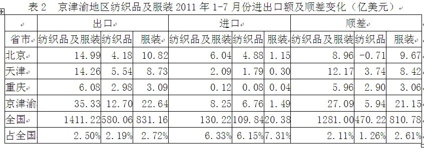 我國京津渝三地2011年1-7月份紡織品及服裝出口額為35.33億美元,占全國紡織品服裝出口總額的2.50%,其中紡織品出口額為12.70億美元,占全國2.19%,服裝出口額為22.64億美元,占全國2.72%;在進(jìn)口方面,京津渝三地紡織品及服裝進(jìn)口額為8.25億美元,占全國紡織品服裝進(jìn)口總額的6.33%,其中紡織品進(jìn)口額為6.76億美元,占全國6.15%,服裝進(jìn)口額為1.49億美元,占全國7.31%;顯示我國京津渝地區(qū)紡織品服裝出口總額遠(yuǎn)高于進(jìn)口總額,順差明顯,表明該地區(qū)紡織品服裝在國際市場上競爭力較強(qiáng)。