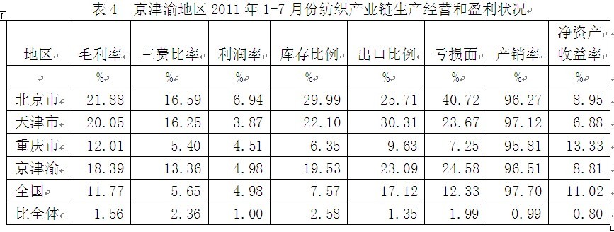 從生產(chǎn)經(jīng)營和盈利狀況看,京津渝紡織產(chǎn)業(yè)鏈毛利率2011年1-7月份為18.39%,為全國平均數(shù)的1.56倍,三費比率(營業(yè)、管理和財務(wù)費用率之和)為13.36%,為全國平均數(shù)的2.36倍,利潤率為4.98%,為全國平均數(shù)的1.00倍;庫存比率為19.53%,為全國平均數(shù)的2.58倍;出口比例為23.09%,為全國平均數(shù)的1.35倍;企業(yè)虧損面為24.58%,為全國平均數(shù)的1.99倍。由此可見,京津渝地區(qū)的盈利狀況接近于全國紡織產(chǎn)業(yè)鏈的平均水平。