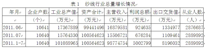 據(jù)國家統(tǒng)計局公布的數(shù)據(jù),2011年1-7月份我國規(guī)模以上紗線行業(yè)企業(yè)數(shù)量為10640家,該行業(yè)實現(xiàn)工業(yè)總產(chǎn)值10109億元,同比增加32.88%;資產(chǎn)合計10056億元,同比增加18.99%;實現(xiàn)主營收入9877億元,同比增加32.75%;完成利潤總額500.28億元,比上年同期增加153.48億元,同比增加44.26%;完成出口交貨值819.60億元,同比增加15.59%;行業(yè)整體從業(yè)人數(shù)288.99萬人,同比增加6.77%。由此可見,紗線行業(yè)總量增長勢頭良好,并為我國經(jīng)濟、財政、出口和就業(yè)作出了重大的貢獻。