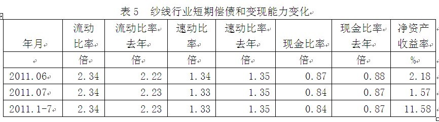 從短期償債和變現(xiàn)能力的變化看,紗線行業(yè)流動比率(流動資產(chǎn)/流動負債)2011年1-7月份為2.34倍,而上年同期為2.23倍,流動比率較高,表明企業(yè)短期償債能力較強;