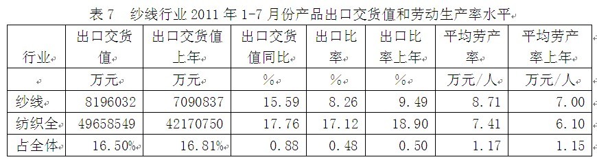 從行業(yè)產(chǎn)品出口交貨值和勞動生產(chǎn)率水平看,2011年1-7月份紗線行業(yè)產(chǎn)品出口交貨值為819.60億元,占紡織全行業(yè)的16.50%;出口交貨值比上年同期增加15.59%;該行業(yè)產(chǎn)品出口比率(出口交貨值/工業(yè)銷售產(chǎn)值)為8.26%,而上年同期為9.49%,表明該行業(yè)產(chǎn)品出口狀況較好;從勞動生產(chǎn)率的水平看,2011年1-7月份紗線行業(yè)平均勞產(chǎn)率(工業(yè)增加值/從業(yè)人數(shù))為8.71萬元/人,而上年同期為7.00萬元/人,表明該行業(yè)勞動生產(chǎn)率的實際水平較為理想。