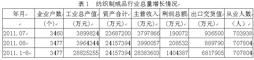 據(jù)國家統(tǒng)計局公布的數(shù)據(jù),2011年1-8月份我國規(guī)模以上紡織制成品行業(yè)(由服用、產(chǎn)業(yè)用和裝飾用三部分紡織終端產(chǎn)品構(gòu)成)企業(yè)數(shù)量為3477家,該行業(yè)實現(xiàn)工業(yè)總產(chǎn)值2882.53億元,同比增加26.19%;資產(chǎn)合計2415.74億元,同比增加20.35%;實現(xiàn)主營收入2838.36億元,同比增加28.77%;完成利潤總額140.44億元,比上年同期增加35.14億元,同比增加33.38%;完成出口交貨值681.8億元,同比增加24.36%;行業(yè)整體從業(yè)人數(shù)70.78萬人,同比增加8.61%。由此可見,紡織制成品行業(yè)總量增長勢頭良好,并為我國經(jīng)濟、財政、出口和就業(yè)作出了重大的貢獻。