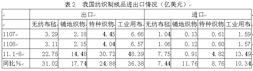 根據(jù)中國海關(guān)的統(tǒng)計數(shù)據(jù),我國2011年1-8月份無紡布氈、絮出口總額22.75億美元,同比增加31.02%;鋪地織物出口總額14.48億美元,同比增加17.74%;特種織物(及花邊)出口總額30.72億美元,同比增加24.88%;工業(yè)用布(及涂層布)出口總額48.39億美元,同比增加36.38%;