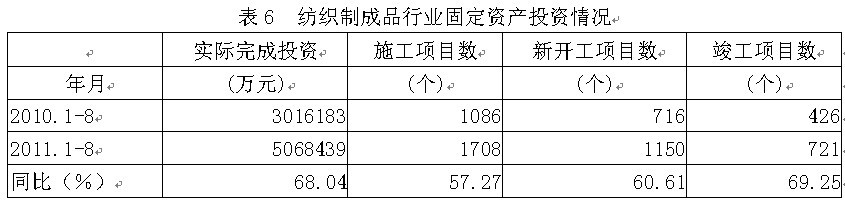 據(jù)國家統(tǒng)計局公布的數(shù)據(jù),2011年1-8月份紡織制成品行業(yè)實際完成投資額506.84億元,同比增加68.04%;當(dāng)年以來到目前為止施工項目總數(shù)為1708個,同比增加57.27%;其中新開工項目數(shù)1150個,同比增加60.61%;截至8月底為止,已實現(xiàn)竣工項目數(shù)721個,同比增加69.25%,占施工項目總數(shù)的42.21%,表明該行業(yè)投資項目進展較好。