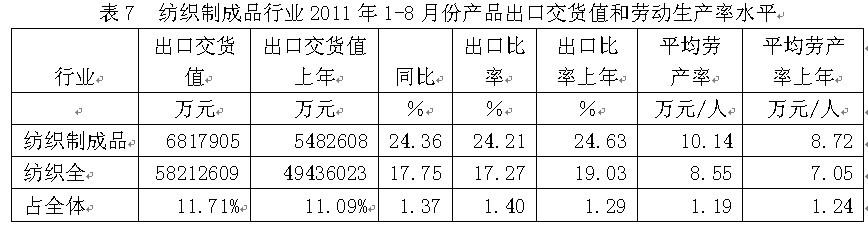 從行業(yè)產(chǎn)品出口交貨值和勞動生產(chǎn)率水平看,2011年1-8月份紡織制成品行業(yè)產(chǎn)品出口交貨值為681.79億元,占紡織全行業(yè)的11.71%;出口交貨值比上年同期增加24.36%;該行業(yè)產(chǎn)品出口比率(出口交貨值/工業(yè)銷售產(chǎn)值)為24.21%,而上年同期為24.63%,表明該行業(yè)產(chǎn)品出口狀況較好;從勞動生產(chǎn)率的水平看,2011年1-8月份紡織制成品行業(yè)平均勞產(chǎn)率(工業(yè)增加值/從業(yè)人數(shù))為10.14萬元/人,而上年同期為8.72萬元/人,表明該行業(yè)勞動生產(chǎn)率的實際水平較為理想。