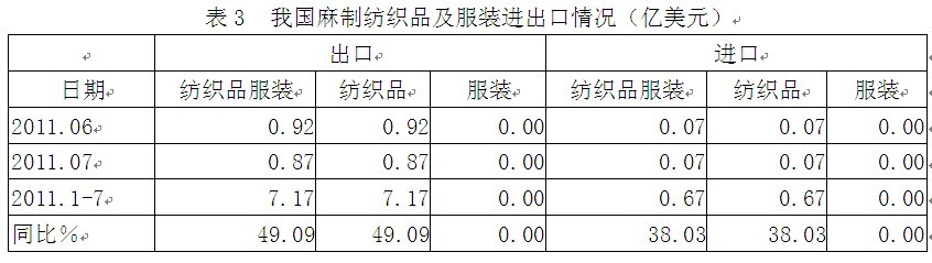 根據(jù)中國(guó)海關(guān)的統(tǒng)計(jì)數(shù)據(jù),我國(guó)2011年1-7月份麻制紡織品及服裝出口總額7.17億美元,同比增加49.09%,占紡織品及服裝出口總額1411.22億美元的0.51%;其中1-7月份麻制紡織品出口總額7.17億美元,同比增加49.09%,占紡織品出口總額580.06億美元的1.24%;
