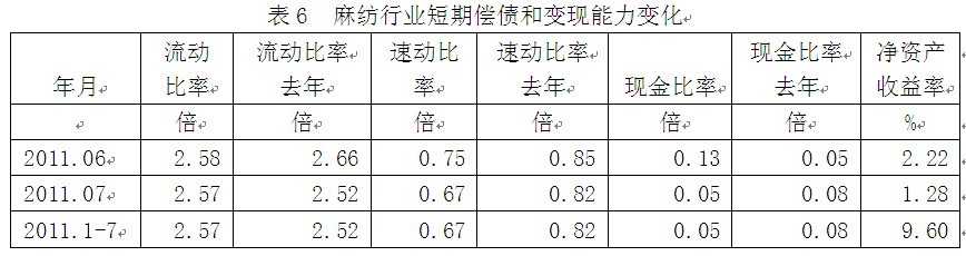 從短期償債和變現(xiàn)能力的變化看,麻紡行業(yè)流動(dòng)比率(流動(dòng)資產(chǎn)/流動(dòng)負(fù)債)2011年1-7月份為2.57倍,而上年同期為2.52倍,流動(dòng)比率較高,表明企業(yè)短期償債能力較強(qiáng);