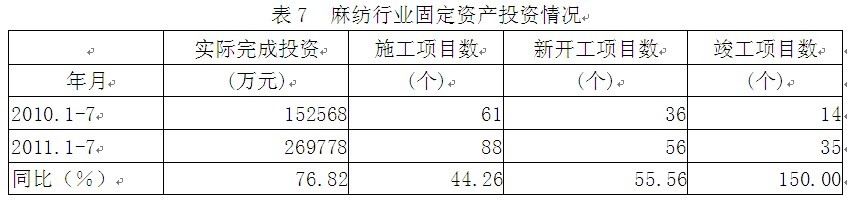 據(jù)國(guó)家統(tǒng)計(jì)局公布的數(shù)據(jù),2011年1-7月份麻紡行業(yè)實(shí)際完成投資額26.98億元,同比增加76.82%;當(dāng)年以來(lái)到目前為止施工項(xiàng)目總數(shù)為88個(gè),同比增加44.26%;其中新開(kāi)工項(xiàng)目數(shù)56個(gè),同比增加55.56%;截至7月底為止,已實(shí)現(xiàn)竣工項(xiàng)目數(shù)35個(gè),同比增加150.00%,占施工項(xiàng)目總數(shù)的39.77%,表明該行業(yè)投資項(xiàng)目進(jìn)展較好。