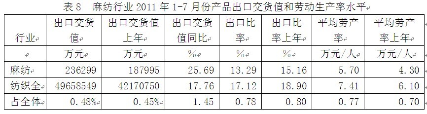 從行業(yè)產(chǎn)品出口交貨值和勞動(dòng)生產(chǎn)率水平看,2011年1-7月份麻紡行業(yè)產(chǎn)品出口交貨值為23.63億元,占紡織全行業(yè)的0.48%;出口交貨值比上年同期增加25.69%;該行業(yè)產(chǎn)品出口比率(出口交貨值/工業(yè)銷售產(chǎn)值)為13.29%,而上年同期為15.16%,表明該行業(yè)產(chǎn)品出口狀況較好;從勞動(dòng)生產(chǎn)率的水平看,2011年1-7月份麻紡行業(yè)平均勞產(chǎn)率(工業(yè)增加值/從業(yè)人數(shù))為5.70萬(wàn)元/人,而上年同期為4.30萬(wàn)元/人,表明該行業(yè)勞動(dòng)生產(chǎn)率的實(shí)際水平較為理想。