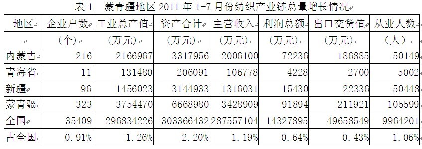 據(jù)國家統(tǒng)計局公布的數(shù)據(jù),2011年1-7月份我國蒙青疆三?。▋?nèi)蒙古、青海省、新疆)紡織產(chǎn)業(yè)鏈(從紡織上游原料到下游服裝)規(guī)模以上企業(yè)數(shù)量為323家,占全國總數(shù)的0.91%;工業(yè)總產(chǎn)值為375.45億元,占1.26%;資產(chǎn)合計為666.90億元,占2.20%;主營收入為342.89億元,占1.19%;利潤總額為9.19億元,占0.64%;出口交貨值為21.19億元,占0.43%;從業(yè)人數(shù)為10.56萬人,占1.06%。由此可見,蒙青疆地區(qū)紡織產(chǎn)業(yè)鏈總產(chǎn)值、總資產(chǎn)、主營收入、利潤總額、出口和就業(yè)均給全國作出了一定的貢獻。