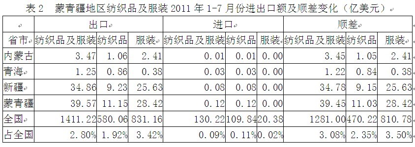 我國蒙青疆三省2011年1-7月份紡織品及服裝出口額為39.57億美元,占全國紡織品服裝出口總額的2.80%,其中紡織品出口額為11.15億美元,占全國1.92%,服裝出口額為28.42億美元,占全國3.42%;在進口方面,蒙青疆三省紡織品及服裝進口額為0.12億美元,占全國紡織品服裝進口總額的0.09%,其中紡織品進口額為0.12億美元,占全國0.11%,服裝進口額為0.004億美元,占全國0.02%;顯示我國蒙青疆地區(qū)紡織品服裝出口總額遠高于進口總額,順差明顯,表明該地區(qū)紡織品服裝在國際市場上競爭力較強。