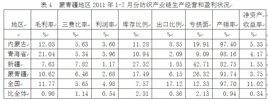從生產(chǎn)經(jīng)營和盈利狀況看,蒙青疆紡織產(chǎn)業(yè)鏈毛利率2011年1-7月份為10.62%,為全國平均數(shù)的0.90倍,三費比率(營業(yè)、管理和財務(wù)費用率之和)為6.46%,為全國平均數(shù)的1.14倍,利潤率為2.68%,為全國平均數(shù)的0.54倍;庫存比率為17.49%,為全國平均數(shù)的2.31倍;出口比例為6.15%,為全國平均數(shù)的0.36倍;企業(yè)虧損面為26.32%,為全國平均數(shù)的2.13倍。由此可見,蒙青疆地區(qū)的盈利狀況接近于全國紡織產(chǎn)業(yè)鏈的平均水平。