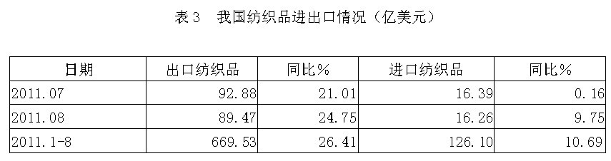 根據(jù)中國海關(guān)的統(tǒng)計數(shù)據(jù),我國2011年1-8月份紡織品出口總額669.53億美元,同比增加26.41%,占紡織品及服裝出口總額1671.58億美元的40.05%;1-8月份紡織品進口總額126.10億美元,同比增加10.69%,占紡織品及服裝進口總額151.05億美元的83.48%;顯示中國紡織品外貿(mào)形勢較好。