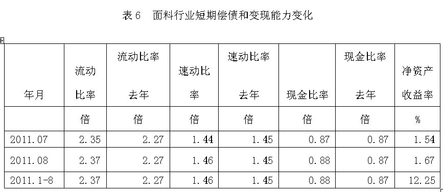 從短期償債和變現(xiàn)能力的變化看,面料行業(yè)流動比率(流動資產(chǎn)/流動負債)2011年1-8月份為2.37倍,而上年同期為2.27倍,流動比率較高,表明企業(yè)短期償債能力較強;