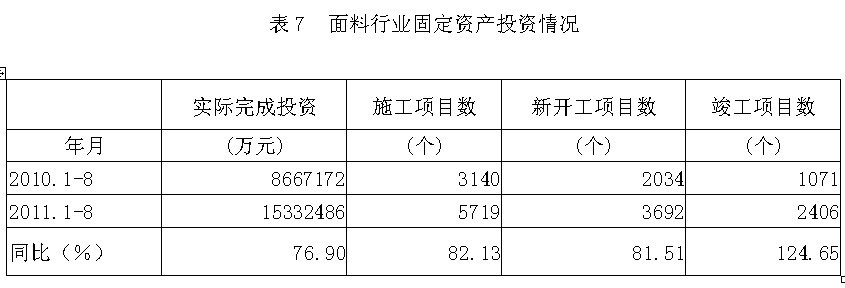 據(jù)國家統(tǒng)計局公布的數(shù)據(jù),2011年1-8月份面料行業(yè)實際完成投資額1533.25億元,同比增加76.90%;當年以來到目前為止施工項目總數(shù)為5719個,同比增加82.13%;其中新開工項目數(shù)3692個,同比增加81.51%;截至8月底為止,已實現(xiàn)竣工項目數(shù)2406個,同比增加124.65%,占施工項目總數(shù)的42.07%,表明該行業(yè)投資項目進展較好。