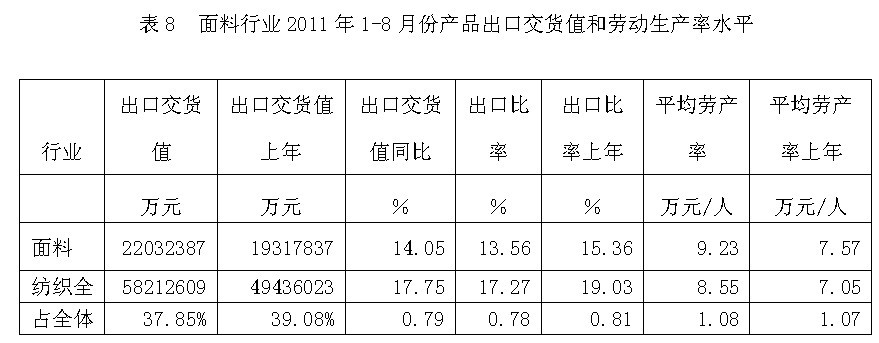 從行業(yè)產(chǎn)品出口交貨值和勞動生產(chǎn)率水平看,2011年1-8月份面料行業(yè)產(chǎn)品出口交貨值為2203.24億元,占紡織全行業(yè)的37.85%;出口交貨值比上年同期增加14.05%;該行業(yè)產(chǎn)品出口比率(出口交貨值/工業(yè)銷售產(chǎn)值)為13.56%,而上年同期為15.36%,表明該行業(yè)產(chǎn)品出口狀況較好;從勞動生產(chǎn)率的水平看,2011年1-8月份面料行業(yè)平均勞產(chǎn)率(工業(yè)增加值/從業(yè)人數(shù))為9.23萬元/人,而上年同期為7.57萬元/人,表明該行業(yè)勞動生產(chǎn)率的實際水平較為理想。