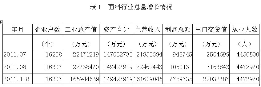 據(jù)國家統(tǒng)計局公布的數(shù)據(jù),2011年1-8月份我國規(guī)模以上面料行業(yè)企業(yè)數(shù)量為16307家,該行業(yè)實現(xiàn)工業(yè)總產(chǎn)值16594億元,同比增加28.86%;資產(chǎn)合計14943億元,同比增加17.93%;實現(xiàn)主營收入16161億元,同比增加29.02%;完成利潤總額775.97億元,比上年同期增加194.30億元,同比增加33.40%;完成出口交貨值2203.24億元,同比增加14.05%;行業(yè)整體從業(yè)人數(shù)447.30萬人,同比增加5.65%。由此可見,面料行業(yè)總量增長勢頭良好,并為我國經(jīng)濟、財政、出口和就業(yè)作出了重大的貢獻。