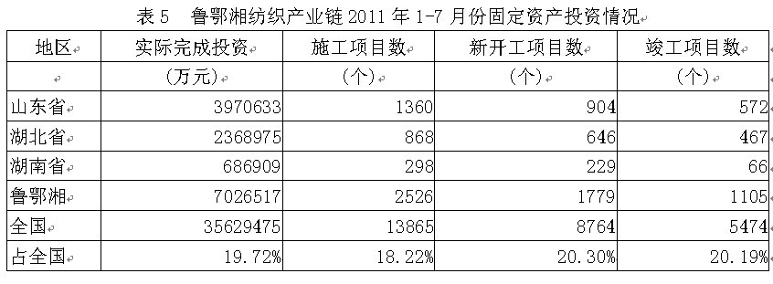 據(jù)國家統(tǒng)計局公布的數(shù)據(jù),2011年1-7月份魯鄂湘地區(qū)紡織產(chǎn)業(yè)鏈實際完成投資額702.65億元,占全國實際投資總額的19.72%;當年以來到目前為止施工項目總數(shù)為2526個,占全國施工總數(shù)的18.22%;其中新開工項目數(shù)1779個,占全國新開工項目總數(shù)的20.30%;截至7月底為止,已實現(xiàn)竣工項目數(shù)1105個,占全國已竣工項目總數(shù)的20.19%,占該地區(qū)施工項目總數(shù)的43.75%,表明該地區(qū)投資項目進展較好。