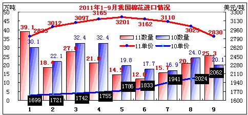 據(jù)海關(guān)統(tǒng)計,今年1-9月,我國棉花進(jìn)口194.31萬噸,同比下降9.8%。進(jìn)口棉花均價3014美元/噸,同比上漲1190美元,漲幅65.2%。前9個月我國棉花進(jìn)口主要呈如下兩個特點: 一是棉花進(jìn)口由價漲量縮向價落量增過渡。從季度進(jìn)口情況看,棉花進(jìn)口量由一季度的85.12萬噸下降到二季度的47.5萬噸,下降了44.2%。三季度又回升到61.68萬噸,比二季度上升29.8%。其中8、9月份均超過20萬噸,9月份升到25.27萬。從進(jìn)口均價看,棉花進(jìn)口均價由一季度的每噸2957美元上升到二季度的3175美元,漲幅7.4%,三季度又回落到2697美元,比二季度下降6.6%。6月份后棉花進(jìn)口價格呈逐月回落態(tài)勢,截止9月份已降至2830美元,比最高時的3201美元下降11.6%,回到年初進(jìn)口水平,但比去年同月上升37.2%。隨著年末的接近和外棉的價比優(yōu)勢,預(yù)計后兩個月的棉花進(jìn)口量還將有進(jìn)一步的增加,價格將有可能進(jìn)一步回落。