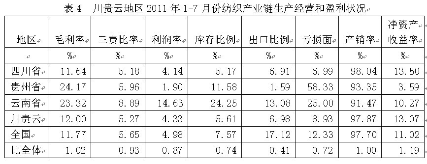 從生產(chǎn)經(jīng)營(yíng)和盈利狀況看,川貴云紡織產(chǎn)業(yè)鏈毛利率2011年1-7月份為12.00%,為全國(guó)平均數(shù)的1.02倍,三費(fèi)比率(營(yíng)業(yè)、管理和財(cái)務(wù)費(fèi)用率之和)為5.27%,為全國(guó)平均數(shù)的0.93倍,利潤(rùn)率為4.33%,為全國(guó)平均數(shù)的0.87倍;庫(kù)存比率為5.61%,為全國(guó)平均數(shù)的0.74倍;出口比例為6.98%,為全國(guó)平均數(shù)的0.41倍;企業(yè)虧損面為8.93%,為全國(guó)平均數(shù)的0.72倍。由此可見(jiàn),川貴云地區(qū)的盈利狀況接近于全國(guó)紡織產(chǎn)業(yè)鏈的平均水平。
