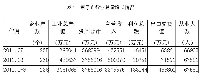 據(jù)國家統(tǒng)計局公布的數(shù)據(jù),2011年1-8月份我國規(guī)模以上簾子布行業(yè)上下游企業(yè)數(shù)量為238家,該行業(yè)實現(xiàn)工業(yè)總產(chǎn)值308.11億元,同比增加25.97%;資產(chǎn)合計375.60億元,同比增加21.77%;實現(xiàn)主營收入337.56億元,同比增加30.50%;完成利潤總額13.31億元,比上年同期增加2.44億元,同比增加22.39%;完成出口交貨值46.7億元,同比增加44.69%;行業(yè)整體從業(yè)人數(shù)6.76萬人,同比增加9.67%。由此可見,簾子布行業(yè)總量增長勢頭良好,并為我國經(jīng)濟、財政、出口和就業(yè)作出了重大的貢獻。