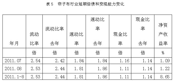 從短期償債和變現(xiàn)能力的變化看,簾子布行業(yè)流動比率(流動資產(chǎn)/流動負(fù)債)2011年1-8月份為2.53倍,而上年同期為2.44倍,流動比率較高,表明企業(yè)短期償債能力較強;
