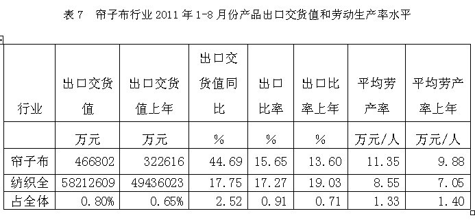 從行業(yè)產(chǎn)品出口交貨值和勞動生產(chǎn)率水平看,2011年1-8月份簾子布行業(yè)產(chǎn)品出口交貨值為46.68億元,占紡織全行業(yè)的0.80%;出口交貨值比上年同期增加44.69%;該行業(yè)產(chǎn)品出口比率(出口交貨值/工業(yè)銷售產(chǎn)值)為15.65%,而上年同期為13.60%,表明該行業(yè)產(chǎn)品出口狀況較好;從勞動生產(chǎn)率的水平看,2011年1-8月份簾子布行業(yè)平均勞產(chǎn)率(工業(yè)增加值/從業(yè)人數(shù))為11.35萬元/人,而上年同期為9.88萬元/人,表明該行業(yè)勞動生產(chǎn)率的實際水平較為理想。