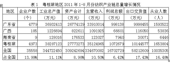 據(jù)國家統(tǒng)計局公布的數(shù)據(jù),2011年1-8月份我國粵桂瓊?cè)。◤V東省、廣西、海南省)紡織產(chǎn)業(yè)鏈(從紡織上游原料到下游服裝)規(guī)模以上企業(yè)數(shù)量為4973家,占全國總數(shù)的13.99%;工業(yè)總產(chǎn)值為3828.71億元,占11.11%;資產(chǎn)合計為2777.33億元,占8.98%;主營收入為3512.50億元,占10.50%;利潤總額為107.27億元,占6.42%;出口交貨值為1014.46億元,占17.43%;從業(yè)人數(shù)為165.38萬人,占16.48%。由此可見,粵桂瓊地區(qū)紡織產(chǎn)業(yè)鏈總產(chǎn)值、總資產(chǎn)、主營收入、利潤總額、出口和就業(yè)均給全國作出了較大的貢獻。