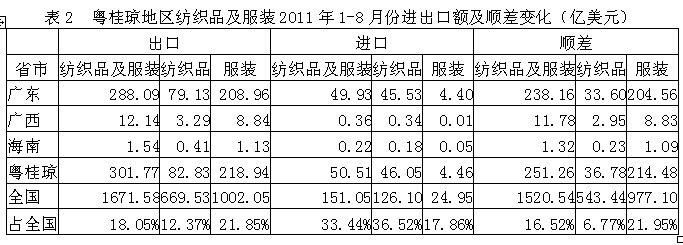 我國粵桂瓊?cè)?011年1-8月份紡織品及服裝出口額為301.77億美元,占全國紡織品服裝出口總額的18.05%,其中紡織品出口額為82.83億美元,占全國12.37%,服裝出口額為218.94億美元,占全國21.85%;在進口方面,粵桂瓊?cè)〖徔椘芳胺b進口額為50.51億美元,占全國紡織品服裝進口總額的33.44%,其中紡織品進口額為46.05億美元,占全國36.52%,服裝進口額為4.46億美元,占全國17.86%;顯示我國粵桂瓊地區(qū)紡織品服裝出口總額遠高于進口總額,順差明顯,表明該地區(qū)紡織品服裝在國際市場上競爭力較強。