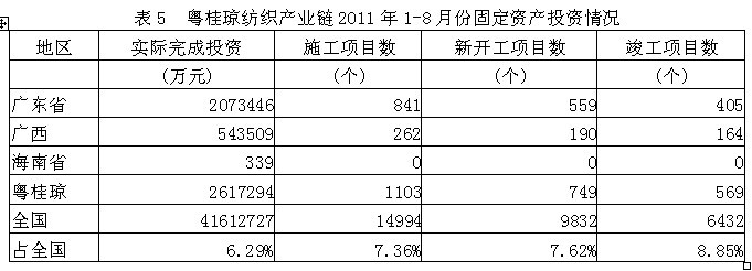 據(jù)國家統(tǒng)計局公布的數(shù)據(jù),2011年1-8月份粵桂瓊地區(qū)紡織產(chǎn)業(yè)鏈實際完成投資額261.73億元,占全國實際投資總額的6.29%;當年以來到目前為止施工項目總數(shù)為1103個,占全國施工總數(shù)的7.36%;其中新開工項目數(shù)749個,占全國新開工項目總數(shù)的7.62%;截至8月底為止,已實現(xiàn)竣工項目數(shù)569個,占全國已竣工項目總數(shù)的8.85%,占該地區(qū)施工項目總數(shù)的51.59%,表明該地區(qū)投資項目進展較好。