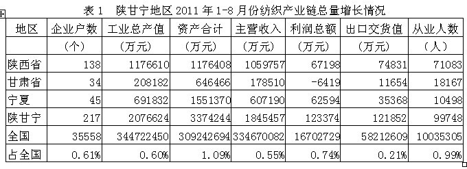 據(jù)國家統(tǒng)計(jì)局公布的數(shù)據(jù),2011年1-8月份我國陜甘寧三省(陜西省、甘肅省、寧夏)紡織產(chǎn)業(yè)鏈(從紡織上游原料到下游服裝)規(guī)模以上企業(yè)數(shù)量為217家,占全國總數(shù)的0.61%;工業(yè)總產(chǎn)值為207.66億元,占0.60%;資產(chǎn)合計(jì)為337.42億元,占1.09%;主營收入為184.55億元,占0.55%;利潤總額為12.34億元,占0.74%;出口交貨值為12.19億元,占0.21%;從業(yè)人數(shù)為9.97萬人,占0.99%。由此可見,陜甘寧地區(qū)紡織產(chǎn)業(yè)鏈總產(chǎn)值、總資產(chǎn)、主營收入、出口和就業(yè)均給全國作出了一定的貢獻(xiàn)。