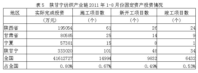 據(jù)國家統(tǒng)計(jì)局公布的數(shù)據(jù),2011年1-8月份陜甘寧地區(qū)紡織產(chǎn)業(yè)鏈實(shí)際完成投資額33.30億元,占全國實(shí)際投資總額的0.80%;當(dāng)年以來到目前為止施工項(xiàng)目總數(shù)為101個(gè),占全國施工總數(shù)的0.67%;其中新開工項(xiàng)目數(shù)48個(gè),占全國新開工項(xiàng)目總數(shù)的0.49%;截至8月底為止,已實(shí)現(xiàn)竣工項(xiàng)目數(shù)34個(gè),占全國已竣工項(xiàng)目總數(shù)的0.53%,占該地區(qū)施工項(xiàng)目總數(shù)的33.66%,表明該地區(qū)投資項(xiàng)目進(jìn)展較好。