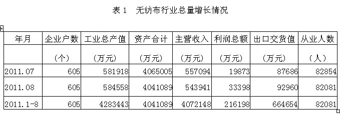 據(jù)國(guó)家統(tǒng)計(jì)局公布的數(shù)據(jù),2011年1-8月份我國(guó)規(guī)模以上無(wú)紡布行業(yè)企業(yè)數(shù)量為605家,該行業(yè)實(shí)現(xiàn)工業(yè)總產(chǎn)值428.34億元,同比增加28.78%;資產(chǎn)合計(jì)404.11億元,同比增加19.67%;實(shí)現(xiàn)主營(yíng)收入407.21億元,同比增加30.59%;完成利潤(rùn)總額21.62億元,比上年同期增加6.27億元,同比增加40.88%;完成出口交貨值66.5億元,同比增加29.95%;行業(yè)整體從業(yè)人數(shù)8.21萬(wàn)人,同比增加6.41%。由此可見(jiàn),無(wú)紡布行業(yè)總量增長(zhǎng)勢(shì)頭良好,并為我國(guó)經(jīng)濟(jì)、財(cái)政、出口和就業(yè)作出了重大的貢獻(xiàn)。