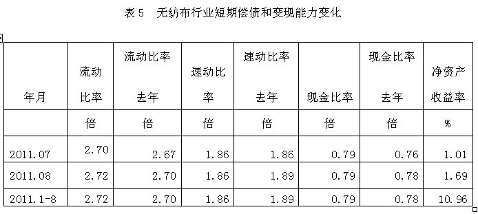 從短期償債和變現(xiàn)能力的變化看,無(wú)紡布行業(yè)流動(dòng)比率(流動(dòng)資產(chǎn)/流動(dòng)負(fù)債)2011年1-8月份為2.72倍,而上年同期為2.70倍,流動(dòng)比率較高,表明企業(yè)短期償債能力較強(qiáng);
