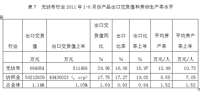從行業(yè)產(chǎn)品出口交貨值和勞動(dòng)生產(chǎn)率水平看,2011年1-8月份無(wú)紡布行業(yè)產(chǎn)品出口交貨值為66.47億元,占紡織全行業(yè)的1.14%;出口交貨值比上年同期增加29.95%;該行業(yè)產(chǎn)品出口比率(出口交貨值/工業(yè)銷售產(chǎn)值)為16.06%,而上年同期為15.97%,表明該行業(yè)產(chǎn)品出口狀況較好;從勞動(dòng)生產(chǎn)率的水平看,2011年1-8月份無(wú)紡布行業(yè)平均勞產(chǎn)率(工業(yè)增加值/從業(yè)人數(shù))為12.99萬(wàn)元/人,而上年同期為10.73萬(wàn)元/人,表明該行業(yè)勞動(dòng)生產(chǎn)率的實(shí)際水平較為理想。