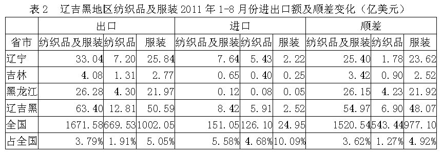 我國(guó)遼吉黑三省2011年1-8月份紡織品及服裝出口額為63.40億美元,占全國(guó)紡織品服裝出口總額的3.79%,其中紡織品出口額為12.81億美元,占全國(guó)1.91%,服裝出口額為50.59億美元,占全國(guó)5.05%;在進(jìn)口方面,遼吉黑三省紡織品及服裝進(jìn)口額為8.42億美元,占全國(guó)紡織品服裝進(jìn)口總額的5.58%,其中紡織品進(jìn)口額為5.91億美元,占全國(guó)4.68%,服裝進(jìn)口額為2.52億美元,占全國(guó)10.09%;顯示我國(guó)遼吉黑地區(qū)紡織品服裝出口總額遠(yuǎn)高于進(jìn)口總額,順差明顯,表明該地區(qū)紡織品服裝在國(guó)際市場(chǎng)上競(jìng)爭(zhēng)力較強(qiáng)。