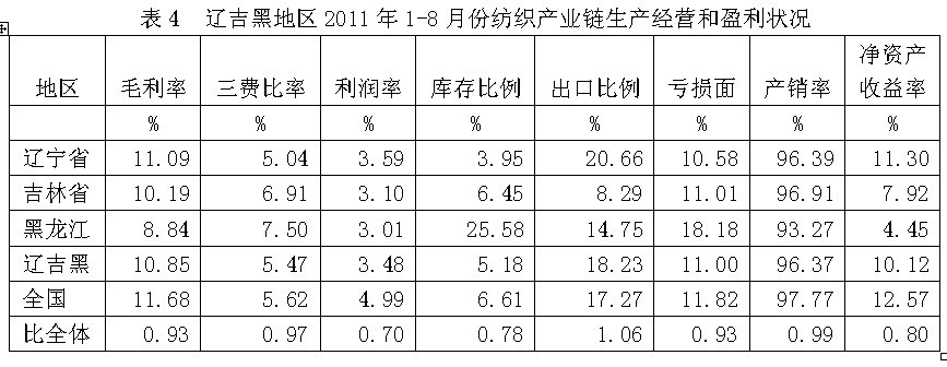從生產(chǎn)經(jīng)營(yíng)和盈利狀況看,遼吉黑紡織產(chǎn)業(yè)鏈毛利率2011年1-8月份為10.85%,為全國(guó)平均數(shù)的0.93倍,三費(fèi)比率(營(yíng)業(yè)、管理和財(cái)務(wù)費(fèi)用率之和)為5.47%,為全國(guó)平均數(shù)的0.97倍,利潤(rùn)率為3.48%,為全國(guó)平均數(shù)的0.70倍;庫(kù)存比率為5.18%,為全國(guó)平均數(shù)的0.78倍;出口比例為18.23%,為全國(guó)平均數(shù)的1.06倍;企業(yè)虧損面為11.00%,為全國(guó)平均數(shù)的0.93倍。由此可見(jiàn),遼吉黑地區(qū)的盈利狀況接近于全國(guó)紡織產(chǎn)業(yè)鏈的平均水平。