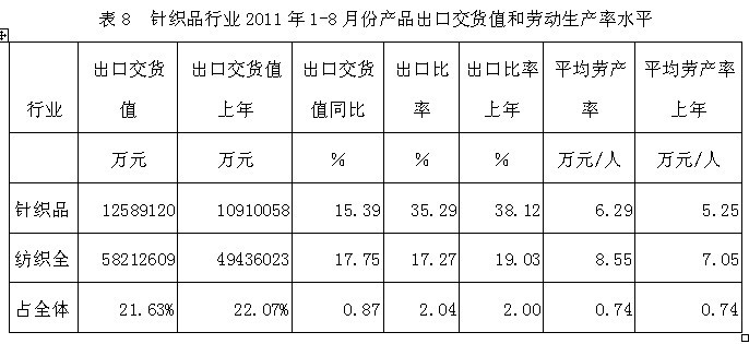 從行業(yè)產(chǎn)品出口交貨值和勞動(dòng)生產(chǎn)率水平看,2011年1-8月份針織品行業(yè)產(chǎn)品出口交貨值為1258.91億元,占紡織全行業(yè)的21.63%;出口交貨值比上年同期增加15.39%;該行業(yè)產(chǎn)品出口比率(出口交貨值/工業(yè)銷售產(chǎn)值)為35.29%,而上年同期為38.12%,表明該行業(yè)產(chǎn)品出口狀況較好;從勞動(dòng)生產(chǎn)率的水平看,2011年1-8月份針織品行業(yè)平均勞產(chǎn)率(工業(yè)增加值/從業(yè)人數(shù))為6.29萬(wàn)元/人,而上年同期為5.25萬(wàn)元/人,表明該行業(yè)勞動(dòng)生產(chǎn)率的實(shí)際水平較為理想。