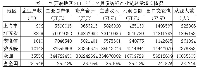 據(jù)國家統(tǒng)計局公布的數(shù)據(jù),2011年1-8月份我國滬蘇皖兩省一市(上海市、江蘇省、安徽?。┘徔棶a(chǎn)業(yè)鏈(從紡織上游原料到下游服裝)規(guī)模以上企業(yè)數(shù)量為10148家,占全國總數(shù)的28.54%;工業(yè)總產(chǎn)值為8765.60億元,占25.43%;資產(chǎn)合計為8335.57億元,占26.95%;主營收入為8551.33億元,占25.55%;利潤總額為421.46億元,占25.23%;出口交貨值為1444.71億元,占24.82%;從業(yè)人數(shù)為237.99萬人,占23.71%。由此可見,滬蘇皖地區(qū)紡織產(chǎn)業(yè)鏈總產(chǎn)值、總資產(chǎn)、主營收入、利潤總額、出口和就業(yè)均給全國作出了巨大的貢獻。