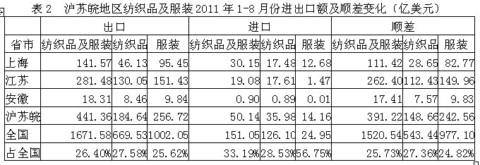 我國滬蘇皖三地2011年1-8月份紡織品及服裝出口額為441.36億美元,占全國紡織品服裝出口總額的26.40%,其中紡織品出口額為184.64億美元,占全國27.58%,服裝出口額為256.72億美元,占全國25.62%;在進口方面,滬蘇皖三地紡織品及服裝進口額為50.14億美元,占全國紡織品服裝進口總額的33.19%,其中紡織品進口額為35.98億美元,占全國28.53%,服裝進口額為14.16億美元,占全國56.75%;顯示我國滬蘇皖地區(qū)紡織品服裝出口總額遠高于進口總額,順差明顯,表明該地區(qū)紡織品服裝在國際市場上競爭力較強。