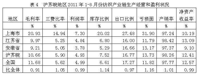從生產(chǎn)經(jīng)營和盈利狀況看,滬蘇皖紡織產(chǎn)業(yè)鏈毛利率2011年1-8月份為10.66%,為全國平均數(shù)的0.91倍,三費比率(營業(yè)、管理和財務費用率之和)為5.90%,為全國平均數(shù)的1.05倍,利潤率為4.93%,為全國平均數(shù)的0.99倍;庫存比率為7.52%,為全國平均數(shù)的1.14倍;出口比例為16.77%,為全國平均數(shù)的0.97倍;企業(yè)虧損面為13.73%,為全國平均數(shù)的1.16倍。由此可見,滬蘇皖地區(qū)的盈利狀況接近于全國紡織產(chǎn)業(yè)鏈的平均水平。