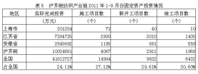 據(jù)國家統(tǒng)計局公布的數(shù)據(jù),2011年1-8月份滬蘇皖地區(qū)紡織產(chǎn)業(yè)鏈實際完成投資額1003.47億元,占全國實際投資總額的24.11%;當年以來到目前為止施工項目總數(shù)為4067個,占全國施工總數(shù)的27.12%;其中新開工項目數(shù)2911個,占全國新開工項目總數(shù)的29.61%;截至8月底為止,已實現(xiàn)竣工項目數(shù)1968個,占全國已竣工項目總數(shù)的30.60%,占該地區(qū)施工項目總數(shù)的48.39%,表明該地區(qū)投資項目進展較好。