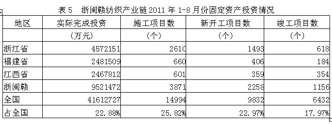據(jù)國家統(tǒng)計局公布的數(shù)據(jù),2011年1-8月份浙閩贛地區(qū)紡織產(chǎn)業(yè)鏈實際完成投資額952.15億元,占全國實際投資總額的22.88%;當年以來到目前為止施工項目總數(shù)為3871個,占全國施工總數(shù)的25.82%;其中新開工項目數(shù)2258個,占全國新開工項目總數(shù)的22.97%;截至8月底為止,已實現(xiàn)竣工項目數(shù)1156個,占全國已竣工項目總數(shù)的17.97%,占該地區(qū)施工項目總數(shù)的29.86%,表明該地區(qū)投資項目進展較好。